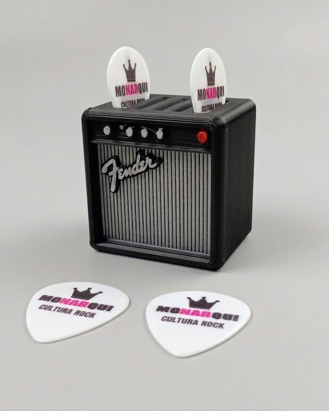 Descubre el Porta Puas Mini Amplificador Fender, un accesorio perfecto para mantener tus púas siempre al alcance. Con capacidad para almacenar hasta 5 púas, este compacto y funcional organizador es ideal para músicos que valoran la comodidad y el estilo.
